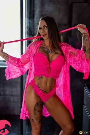 Fræk stripper brunette, med masser af tatoveringer og den helt rigtige attitude. Brysterne er skruet helt rigtig på og hun har det frækkeste blik i øjnene.